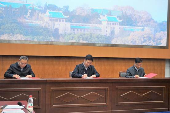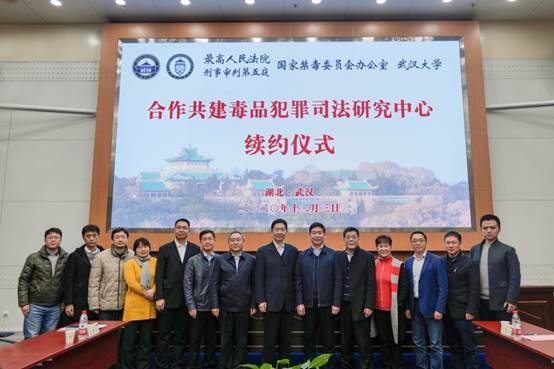 党委副书记沈壮海,最高人民法院刑事审判庭第五庭副庭长方文军,国家禁毒委员会办公室、公安部禁毒局政策法规处处长李晓代表三方机构,签署了合作共建毒品犯罪司法研究中心的续约协议。