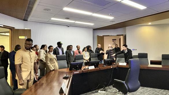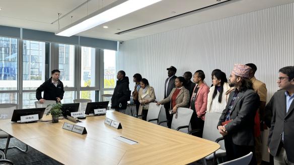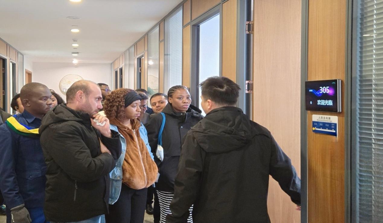 随后,在办公楼四楼,师生们参观了武仲的仲裁庭,包括线上仲裁庭和线下仲裁庭。张秘书展示了仲裁庭的硬件设备,并介绍了线上、线下仲裁庭的运作情况,留学生们饶有兴趣,详细询问仲裁服务的具体运作模式,认真记录相关实务细节,了解现代化仲裁机构的基础设施建设;还有学生提出了涉及临时仲裁和机构仲裁的相关问题。