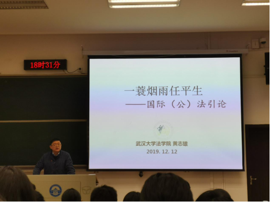 第十二期讲座由国际公法学教研室黄志雄教授主讲,主题是“一蓑烟雨任平生——国际公法引论”。黄老师围绕国际公法是什么、国际公法不是什么、国际公法与中国的和平发展三个部分展开讲座,激发了同学们对国际公法的探索热情。