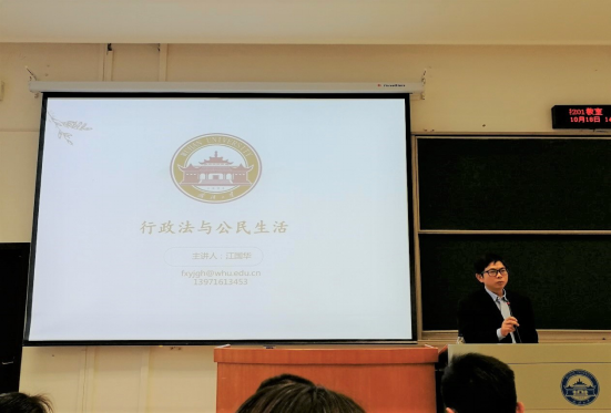 第五期讲座“行政法与公民生活”由宪法与行政法学教研室江国华教授主讲。江老师饱含激情地为同学们讲述了行政法的内涵与重要意义,辅之以丰富的现实案例和法律规范,向同学们生动展示了一个贯穿于日常生活,由管理转向服务、并不断完善的行政法。