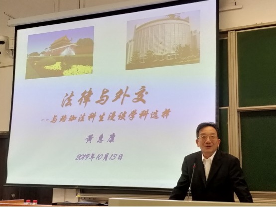 第四期讲座由曾任中华人民共和国驻马来西亚特命全权大使的资深外交官黄惠康教授主讲,主题是“法律与外交——与珞珈法科生漫谈学科选择”。黄老师从上篇“外交掠影”和下篇“外交与法律的融合”两部分展开此次讲座。此次讲座不仅激发了大家对于国际法和外交事业的兴趣与热情,更让同学们对个人职业规划有了崭新的思考。