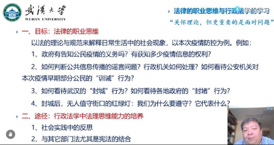 伍华军副教授本学期为2019级学生讲授《行政法》,在网络教学同时,他十分关注学生的感受与反馈。针对学生提出的MOOC课程教学互动不够、无法满足学生个性化需求等情况,伍老师立即决定补充采用直播方式,使用贴近生活真实而又有趣味的案例,尽可能深入浅出地讲解行政法重难点。课外他还积极与学生互动,帮助学生解答学习与生活上的困惑。