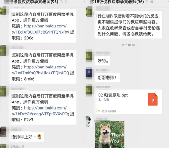 身处偏远农村,缺乏基本的教学资源,网络环境差,这是李承亮副教授的实际情况。“春节回老家,没带电脑,不幸的是手机也出了问题,在刚接到网络教学任务时,我心里很焦虑,担心课程上不好。”这是李老师一开始的真实感受。在了解学校网络教学要求后,他找朋友借了一部手机,将课程内容分段录音后提前上传云盘;在助教的帮助下,由他口述助教制作ppt。通过微信群提取录音+ppt的形式,《侵权责任法》顺利开课,同学们反映良好。