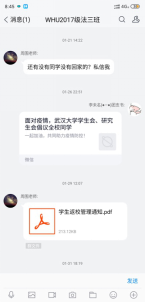 有三名本科生留校,辅导员每日通过QQ、微信、电话等方式联系学生,跟踪体温数据变化,解决留校生活困难,送上口罩等防护用品。针对返乡学生采取网格化管理,充分发挥班级学生干部的作用,确保及时掌握每名学生信息,尤其对在汉学生成立独立微信群重点关注。