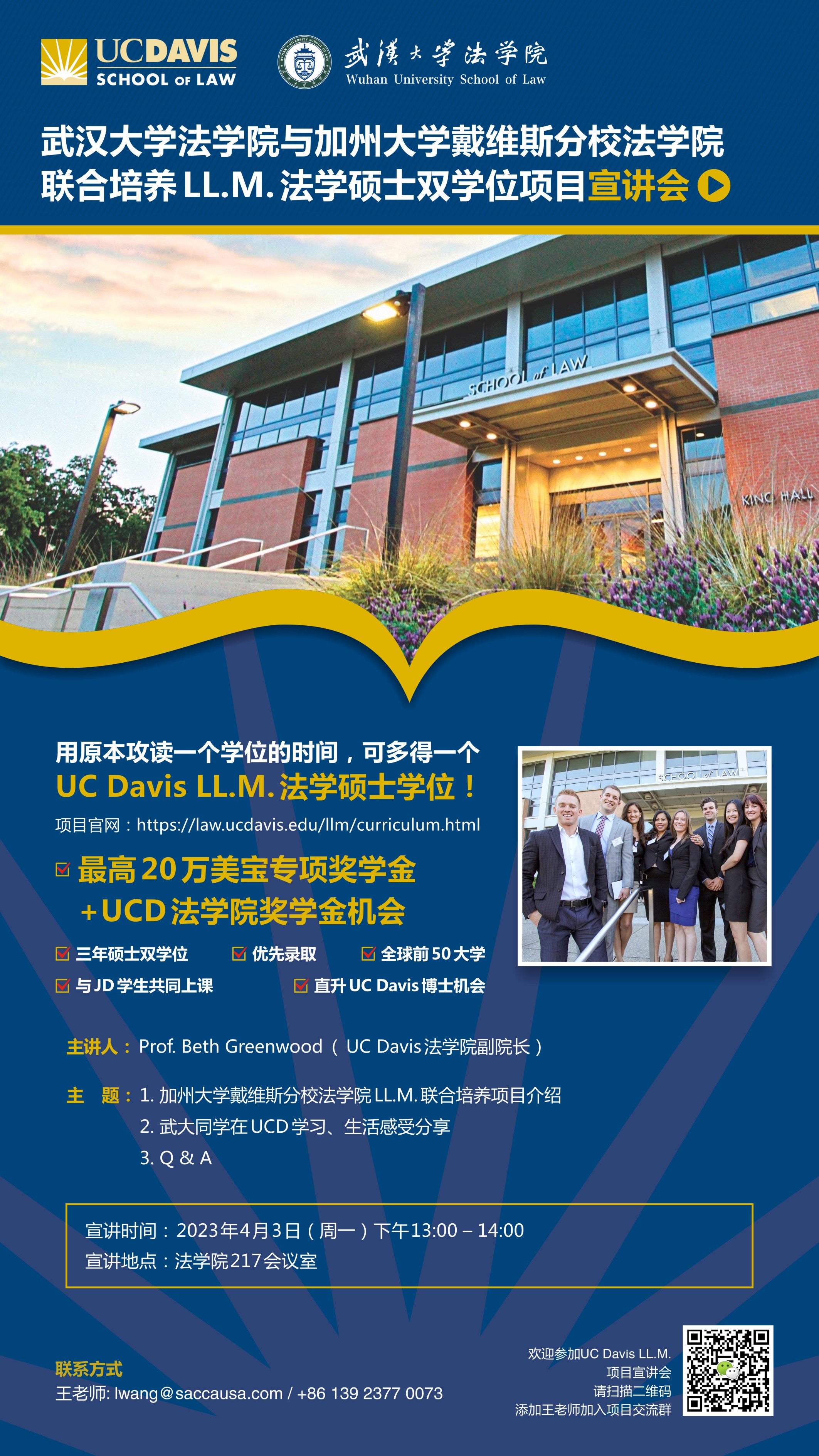 主 题:美国加州大学戴维斯分校成人直播 联合培养LLM法学硕士双学位项目宣讲会