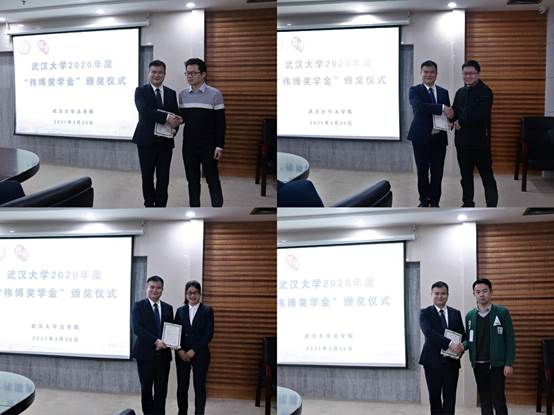 At first, Prof. Qin Qianhong introduced the "Weibo Scholarship" Afterwards, Ms. Xie Yawei read out the award decision and the list of awarded students, and expressed her gratitude to Weibo Law Firm for their financial support. Mr. Li Weimin, Director of Weibo Law Firm, presented the awards to the students, and Mr. Zhang Quan, a doctoral student of 2018, spoke on behalf of the students.